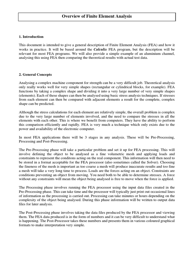 1. Introduction This document is intended to give a general description of Finite Element Analysis (FEA) and how it works in practice. It will be based around the Calculix FEA program, but the description will be relevant for most FEA programs. We will also provide a simple example of an aluminium channel, analysing this using FEA then comparing the theoretical results with actual test data.