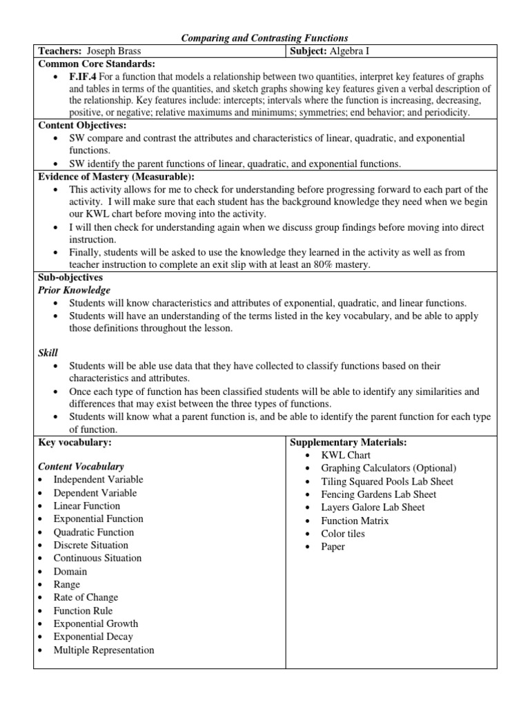 .4 For a function that models a relationship between two quantities, interpret key features of graphs and tables in terms of the quantities, and sketch graphs showing key features given a verbal description of the relationship. Key features include: intercepts; intervals where the function is increasing, decreasing, positive, or negative; relative maximums and minimums; symmetries; end behavior; and periodicity. Content Objectives: SW compare and contrast the attributes and characteristics of linear, quadratic, and exponential functions. SW identify the parent functions of linear, quadratic, and exponential functions. Evidence of Mastery (Measurable): This activity allows for me to check for understanding before progressing forward to each part of the activity. I will make sure that each student has the background knowledge they need when we begin our KWL chart before moving into the activity. I will then check for understanding again when we discuss group findings before moving into direct instruction. Finally, students will be asked to use the knowledge they learned in the activity as well as from teacher instruction to complete an exit slip with at least an 80% mastery. Sub-objectives Prior Knowledge Students will know characteristics and attributes of exponential, quadratic, and linear functions. Students will have an understanding of the terms listed in the key vocabulary, and be able to apply those definitions throughout the lesson. Skill