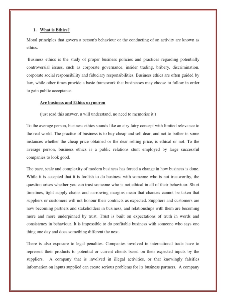 Business ethics is the study of proper business policies and practices regarding potentially controversial issues, such as corporate governance, insider trading, bribery, discrimination, corporate social responsibility and fiduciary responsibilities. Business ethics are often guided by law, while other times provide a basic framework that businesses may choose to follow in order to gain public acceptance. Are business and Ethics oxymoron (just read this answer, u will understand, no need to memorise it ) To the average person, business ethics sounds like an airy fairy concept with limited relevance to the real world. The practice of business is to buy cheap and sell dear, and not to bother in some instances whether the cheap price obtained or the dear selling price, is ethical or not. To the average person, business ethics is a public relations stunt employed by large successful companies to look good. The pace, scale and complexity of modern business has forced a change in how business is done. While it is accepted that it is foolish to do business with someone who is not trustworthy, the question arises whether you can trust someone who is not ethical in all of their behaviour. Short timelines, tight supply chains and narrowing margins mean that chances cannot be taken that suppliers or customers will not honour their contracts as expected. Suppliers and customers are now becoming partners and stakeholders in business, and relationships with them are becoming more and more underpinned by trust. Trust is built on expectations of truth in words and consistency in behaviour. It is impossible to do profitable business with someone who says one thing one day and does something different the next. There is also exposure to legal penalties. Companies involved in international trade have to represent their products to potential or current clients based on their expected inputs by the suppliers. A company that is involved in illegal activities, or that knowingly falsifies