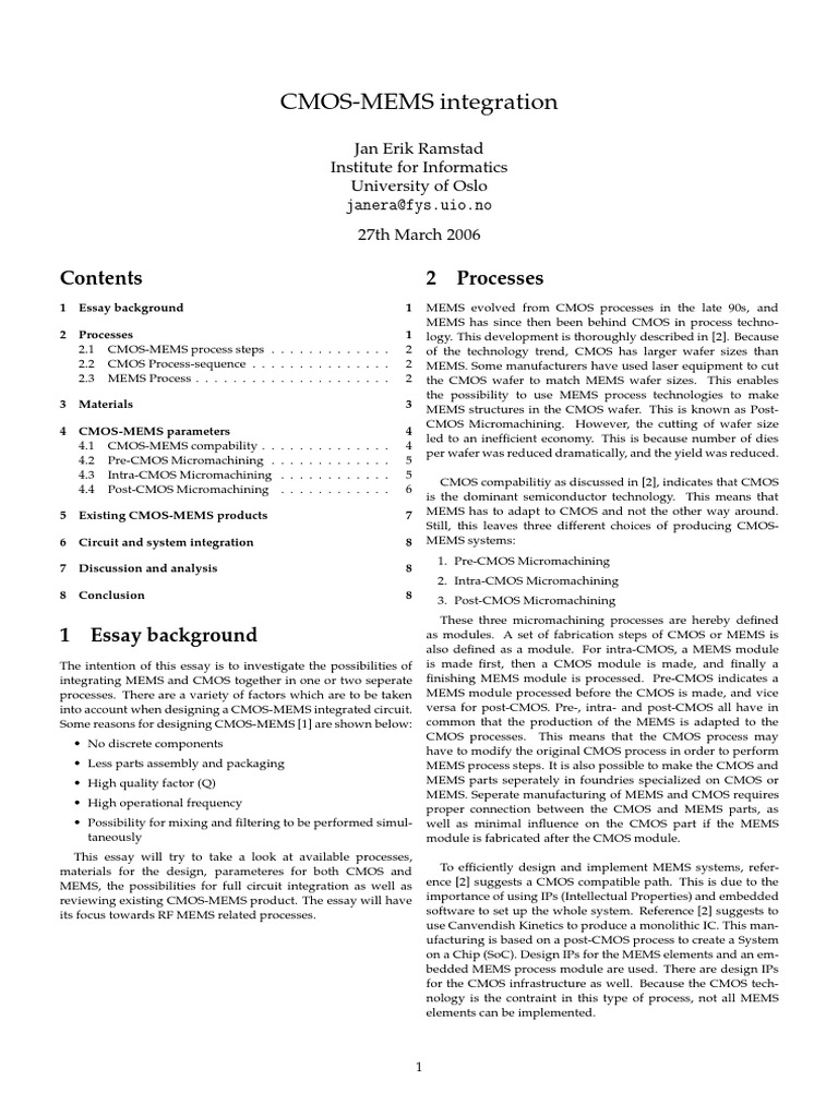 The intention of this essay is to investigate the possibilities of integrating MEMS and CMOS together in one or two seperate processes. There are a variety of factors which are to be taken into account when designing a CMOS-MEMS integrated circuit. Some reasons for designing CMOS-MEMS [1] are shown below: No discrete components Less parts assembly and packaging High quality factor (Q) High operational frequency Possibility for mixing and ltering to be performed simultaneously This essay will try to take a look at available processes, materials for the design, parameteres for both CMOS and MEMS, the possibilities for full circuit integration as well as reviewing existing CMOS-MEMS product. The essay will have its focus towards RF MEMS related processes.