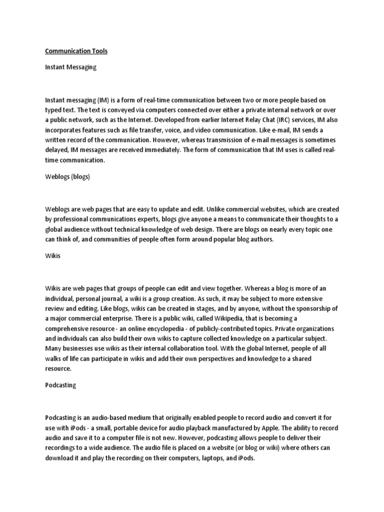 Instant messaging (IM) is a form of real-time communication between two or more people based on typed text. The text is conveyed via computers connected over either a private internal network or over a public network, such as the Internet. Developed from earlier Internet Relay Chat (IRC) services, IM also incorporates features such as file transfer, voice, and video communication. Like e-mail, IM sends a written record of the communication. However, whereas transmission of e-mail messages is sometimes delayed, IM messages are received immediately. The form of communication that IM uses is called realtime communication. Weblogs (blogs)