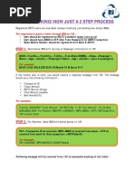 BOOK NDLS,ALD,280313,12418,SL,varun,23,m,ezaz,23,m,priyanka,24,f,sukhbir,25,m SMS response for the above example will be: Availability details are TxnID: 92224487261426141055, Fare:277 (Incl.ISC:Rs10,ASC:Rs10,PG:Rs10) Avail: AVAILABLE-0529. Please send SMS PAY 92224487261426141055,IMPS/MPAY to 5676714 to book ticket. Step 2 For booking a ticket To proceed for booking the ticket, user needs to make payment by sending SMS to 5676714 as per the following format (without double quotes): PAY TransactionID,<IMPS> or <MPAY> The user can pay either through IMPS or through mWallet For example: PAY 92224487261426141055,MPAY SMS response for the above example will be: Booking successful. PNR: 5612345567, TRAIN: 12418, DOJ: 28/03/2013 Dep.Time: 22:30 NDLS to ALD, VARUN Confirm S6 0035, EZAZ Confirm S6 0036, PRIYANKA Confirm S6 0037, SUKHBIR Confirm S6 0038