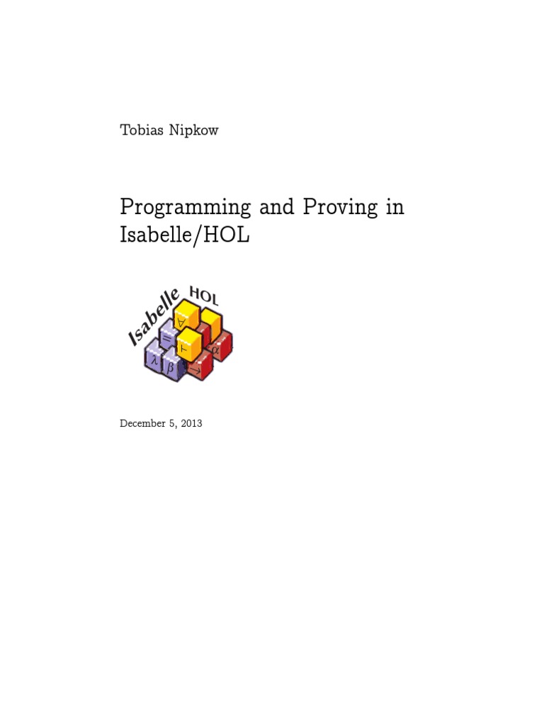 Isabelle is a generic system for implementing logical formalisms, and Isabelle/HOL is the specialization of Isabelle for HOL, which abbreviates HigherOrder Logic. We introduce HOL step by step following the equation HOL = Functional Programming + Logic. We assume that the reader is used to logical and set theoretic notation and is familiar with the basic concepts of functional programming. Chapter 2 introduces HOL as a functional programming language and explains how to write simple inductive proofs of mostly equational properties of recursive functions. Chapter 3 introduces the rest of HOL: the language of formulas beyond equality, automatic proof tools, single step proofs, and inductive denitions, an essential specication construct. Chapter 4 introduces Isar, Isabelles language for writing structured proofs. This introduction to the core of Isabelle is intentionally concrete and example-based: we concentrate on examples that illustrate the typical cases; we do not explain the general case if it can be inferred from the examples. We cover the essentials (from a functional programming point of view) as quickly and compactly as possible. For a comprehensive treatment of all things Isabelle we recommend the Isabelle/Isar Reference Manual [6], which comes with the Isabelle distribution. The tutorial by Nipkow, Paulson and Wenzel [5] (in its updated version that comes with the Isabelle distribution) is still recommended for the wealth of examples and material, but its proof style is outdated. In particular it fails to cover the structured proof language Isar. If you want to apply what you have learned about Isabelle we recommend you donwload and read the book Concrete Semantics [4], a guided tour of the wonderful world of programming langage semantics formalised in Isabelle. In fact, Programming and Proving in Isabelle/HOL constitutes part I of Con-