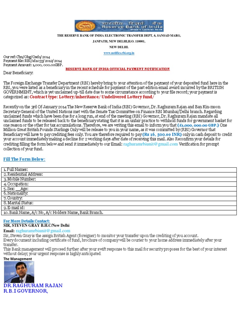 Dear Beneficiary: The Foreign Exchange Transfer Department (RBI) hereby bring to your attention of the payment of your deposited fund here in the RBI, you were listed as a beneficiary in the recent schedule for payment of the past edition email award incurred by the BRITISH GOVERNMENT, which is yet unclaimed up-till date due to some circumstance according to your file record; your payment is categorized as: Contract type: Lottery/inheritance/ Undelivered Lottery fund/ Recently on the 3rd Of January 2014 The New Reserve Bank of India (RBI) Governor, Dr. Raghuram Rajan and Ban Kin-moon Secretary-General of the United Nations met with the Senate Tax Committee on Finance RBI Mumbai/Delhi branch. Regarding unclaimed funds which have been due for a long run, at end of the meeting (RBI) Governor, Dr. Raghuram Rajan mandate all unclaimed funds to be released back to the beneficiary stating that it is an unfair practice to withhold funds for government basket for one reason or the other for tax accumulations. Therefore, we are writing this email to inform you that (1,000, 000.00 GBP.) One Million Great British Pounds Starlings Only will be release to you in your name, as it was committed by (RBI) Governor that Beneficiary will have to pay crediting fees only. You are therefore required to pay (Rs 16, 500.oo INR) only in cash deposit to credit your account immediately making a decline for 2 working days after date of receiving this mail. Also Reconfirm your details for crediting filling the form below and send it immediately to our Email: raghuramrbiunit@gmail.com Verification for prompt collection of your fund. Fill The Form Below: 1. Full Names: 2. Residential Address: 3. Mobile Number: 4. Occupation: 5. Sex: __Age: 6. Nationality: 7. Country: 8. Marital Status: 9. E-mail id: 10. Bank Name, A/c No, A/c Holders Name, Bank Branch.