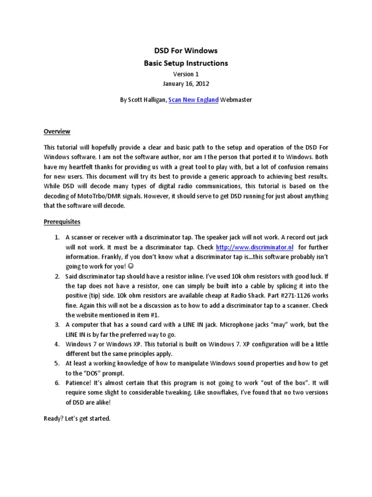Overview This tutorial will hopefully provide a clear and basic path to the setup and operation of the DSD For Windows software. I am not the software author, nor am I the person that ported it to Windows. Both have my heartfelt thanks for providing us with a great tool to play with, but a lot of confusion remains for new users. This document will try its best to provide a generic approach to achieving best results. While DSD will decode many types of digital radio communications, this tutorial is based on the decoding of MotoTrbo/DMR signals. However, it should serve to get DSD running for just about anything that the software will decode. Prerequisites 1. A scanner or receiver with a discriminator tap. The speaker jack will not work. A record out jack will not work. It must be a discriminator tap. Check http://www.discriminator.nl for further information. Frankly, if you dont know what a discriminator tap isthis software probably isnt going to work for you! 2. Said discriminator tap should have a resistor inline. Ive used 10k ohm resistors with good luck. If the tap does not have a resistor, one can simply be built into a cable by splicing it into the positive (tip) side. 10k ohm resistors are available cheap at Radio Shack. Part #271-1126 works fine. Again this will not be a discussion as to how to add a discriminator tap to a scanner. Check the website mentioned in item #1. 3. A computer that has a sound card with a LINE IN jack. Microphone jacks may work, but the LINE IN is by far the preferred way to go. 4. Windows 7 or Windows XP. This tutorial is built on Windows 7. XP configuration will be a little different but the same principles apply. 5. At least a working knowledge of how to manipulate Windows sound properties and how to get to the DOS prompt. 6. Patience! Its almost certain that this program is not going to work out of the box. It will require some slight to considerable tweaking. Like snowflakes, Ive found that no two versions of DSD are alike! Ready? Lets get started.