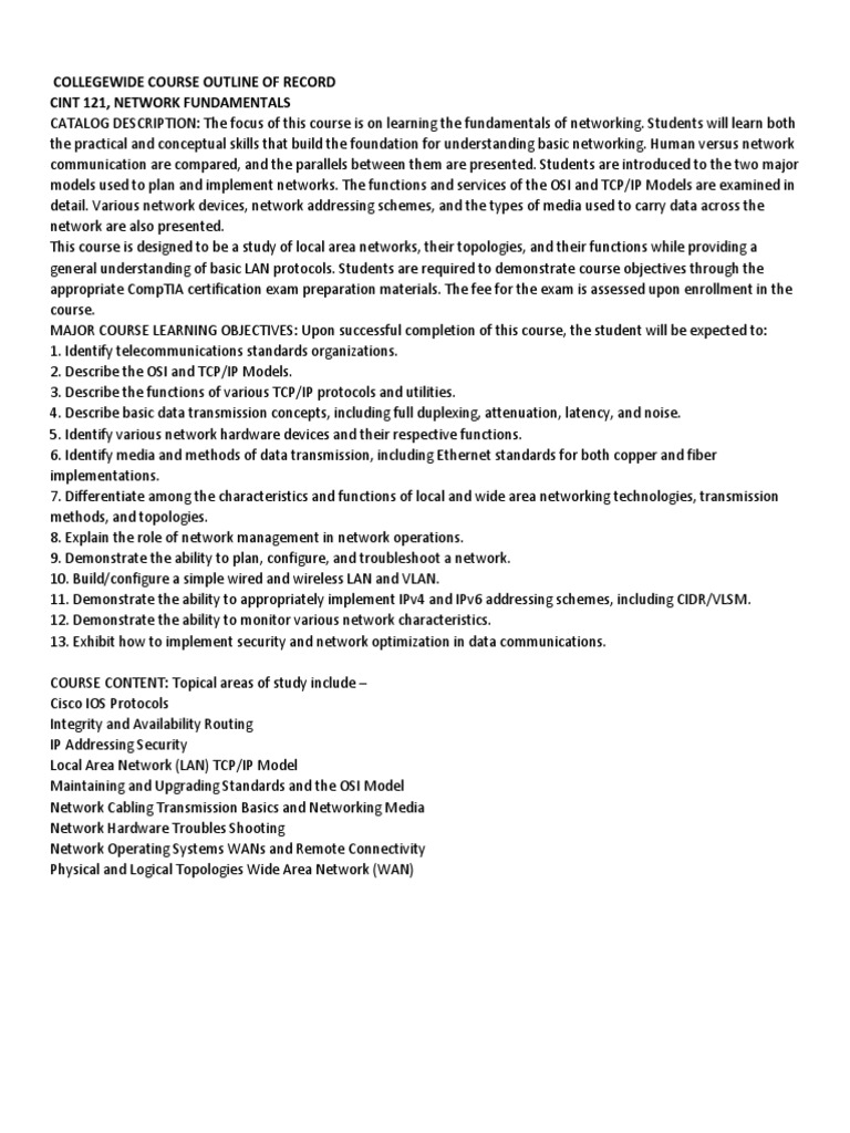 COLLEGEWIDE COURSE OUTLINE OF RECORD CINT 121, NETWORK FUNDAMENTALS CATALOG DESCRIPTION: The focus of this course is on learning