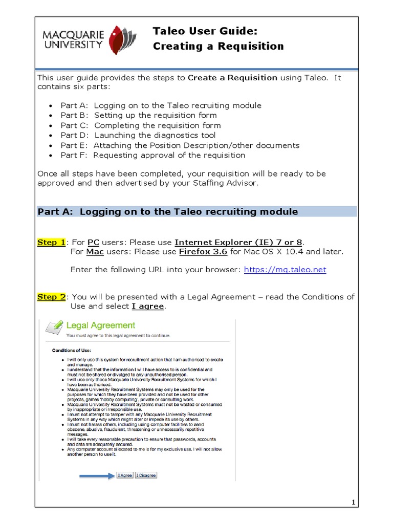 This user guide provides the steps to Create a Requisition using Taleo. It contains six parts: Part Part Part Part Part Part A: B: C: D: E: F: Logging on to the Taleo recruiting module Setting up the requisition form Completing the requisition form Launching the diagnostics tool Attaching the Position Description/other documents Requesting approval of the requisition