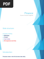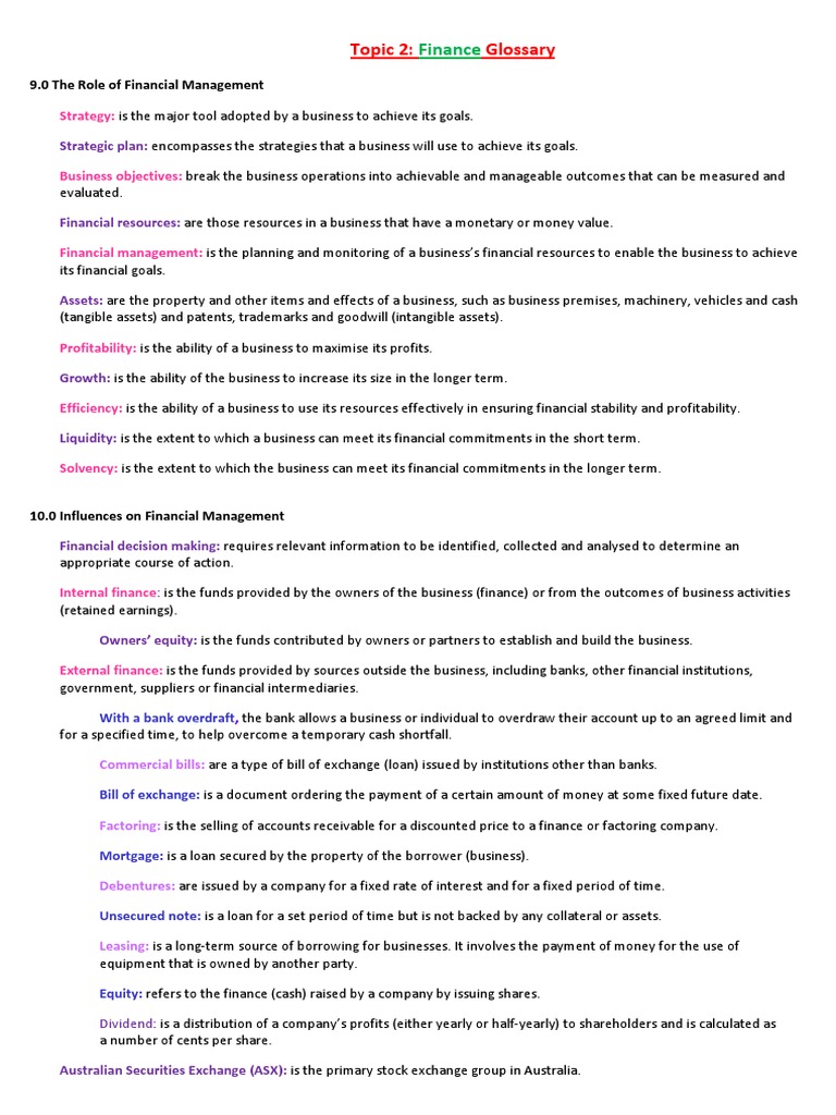 9.0 The Role of Financial Management Strategy: is the major tool adopted by a business to achieve its goals. Strategic plan: encompasses the strategies that a business will use to achieve its goals. Business objectives: break the business operations into achievable and manageable outcomes that can be measured and evaluated. Financial resources: are those resources in a business that have a monetary or money value. Financial management: is the planning and monitoring of a businesss financial resources to enable the business to achieve its financial goals. Assets: are the property and other items and effects of a business, such as business premises, machinery, vehicles and cash (tangible assets) and patents, trademarks and goodwill (intangible assets). Profitability: is the ability of a business to maximise its profits. Growth: is the ability of the business to increase its size in the longer term. Efficiency: is the ability of a business to use its resources effectively in ensuring financial stability and profitability. Liquidity: is the extent to which a business can meet its financial commitments in the short term. Solvency: is the extent to which the business can meet its financial commitments in the longer term. 10.0 Influences on Financial Management Financial decision making: requires relevant information to be identified, collected and analysed to determine an appropriate course of action. Internal finance: is the funds provided by the owners of the business (finance) or from the outcomes of business activities (retained earnings). Owners equity: is the funds contributed by owners or partners to establish and build the business. External finance: is the funds provided by sources outside the business, including banks, other financial institutions, government, suppliers or financial intermediaries. With a bank overdraft, the bank allows a business or individual to overdraw their account up to an agreed limit and for a specified time, to help overcome a temporary cash shortfall. Commercial bills: are a type of bill of exchange (loan) issued by institutions other than banks. Bill of exchange: is a document ordering the payment of a certain amount of money at some fixed future date. Factoring: is the selling of accounts receivable for a discounted price to a finance or factoring company. Mortgage: is a loan secured by the property of the borrower (business). Debentures: are issued by a company for a fixed rate of interest and for a fixed period of time. Unsecured note: is a loan for a set period of time but is not backed by any collateral or assets. Leasing: is a long-term source of borrowing for businesses. It involves the payment of money for the use of equipment that is owned by another party. Equity: refers to the finance (cash) raised by a company by issuing shares. Dividend: is a distribution of a companys profits (either yearly or half-yearly) to shareholders and is calculated as a number of cents per share. Australian Securities Exchange (ASX): is the primary stock exchange group in Australia.