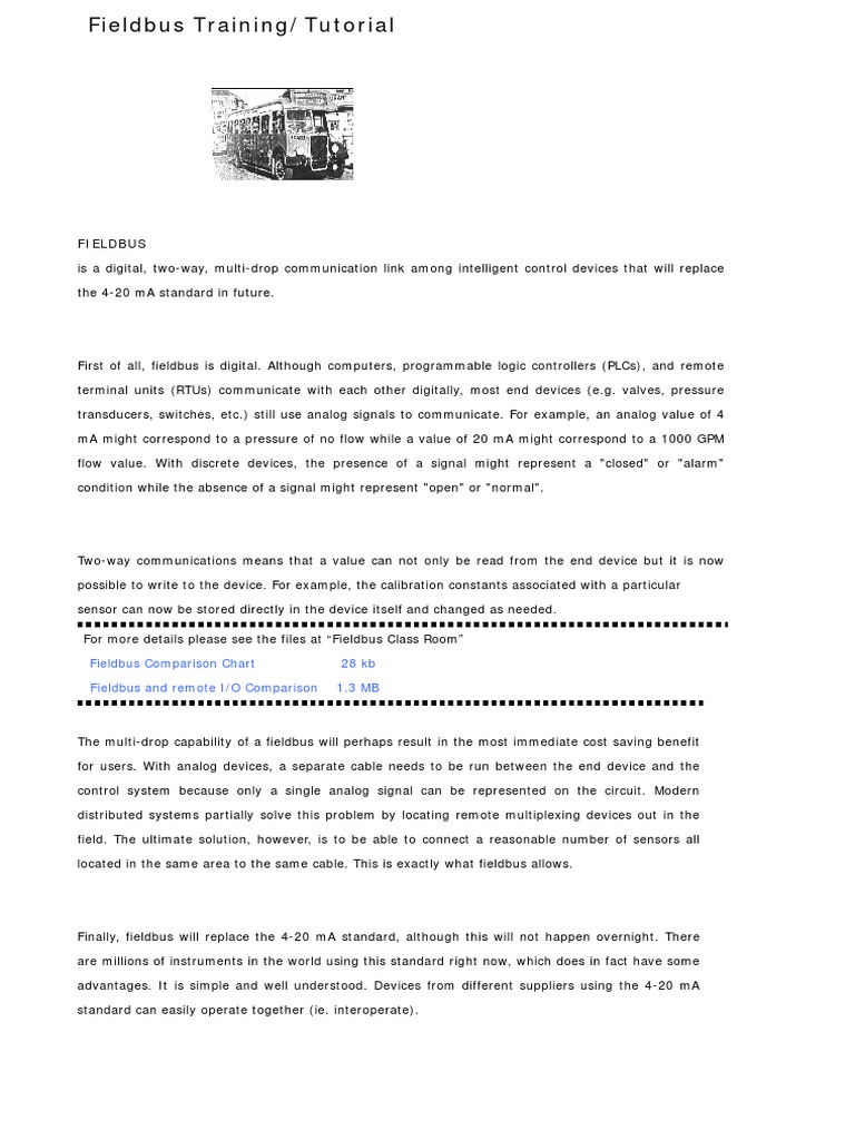 Two-way communications means that a value can not only be read from the end device but it is now possible to write to the device. For example, the calibration constants associated with a particular sensor can now be stored directly in the device itself and changed as needed. For more details please see the files at Fieldbus Class Room Fieldbus Comparison Chart Fieldbus and remote I/O Comparison 28 kb 1.3 MB
