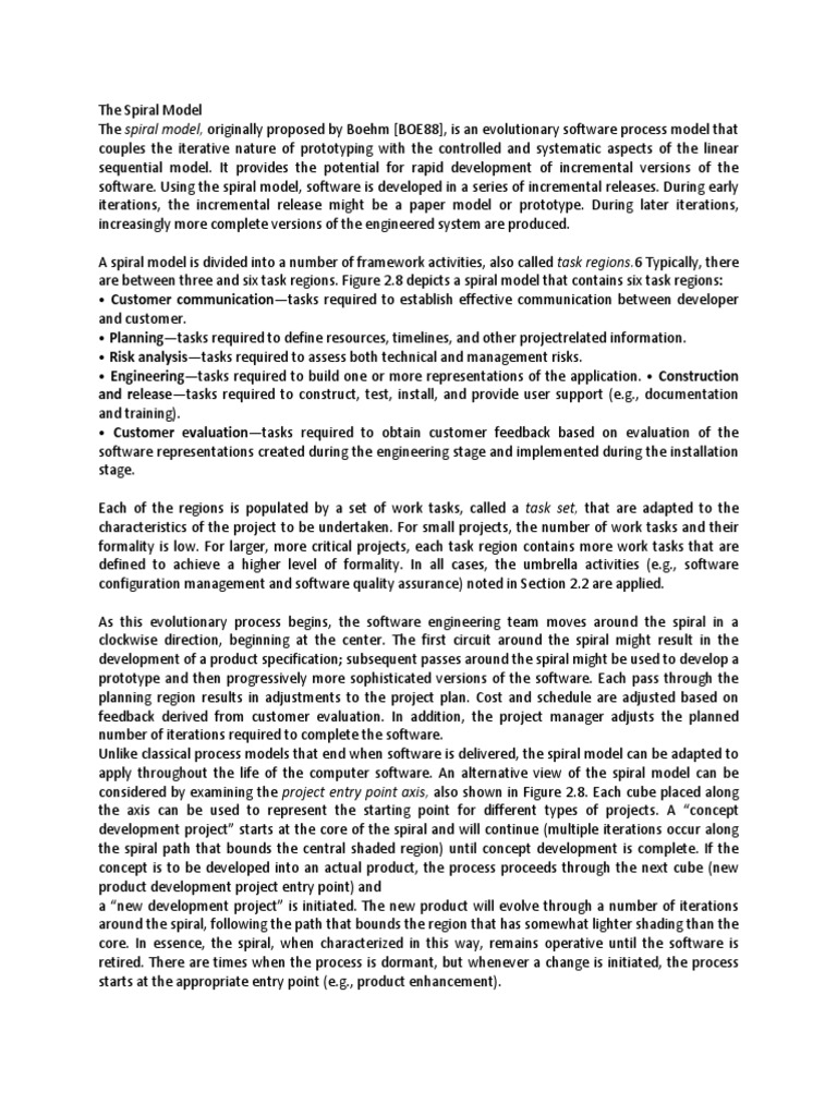 couples the iterative nature of prototyping with the controlled and systematic aspects of the linear sequential model. It provides the potential for rapid development of incremental versions of the software. Using the spiral model, software is developed in a series of incremental releases. During early iterations, the incremental release might be a paper model or prototype. During later iterations, increasingly more complete versions of the engineered system are produced. A spiral model is divided into a number of framework activities, also called task regions.6 Typically, there are between three and six task regions. Figure 2.8 depicts a spiral model that contains six task regions: Customer communicationtasks required to establish effective communication between developer and customer. Planningtasks required to define resources, timelines, and other projectrelated information. Risk analysistasks required to assess both technical and management risks. Engineeringtasks required to build one or more representations of the application. Construction and releasetasks required to construct, test, install, and provide user support (e.g., documentation and training). Customer evaluationtasks required to obtain customer feedback based on evaluation of the software representations created during the engineering stage and implemented during the installation stage. Each of the regions is populated by a set of work tasks, called a task set, that are adapted to the characteristics of the project to be undertaken. For small projects, the number of work tasks and their formality is low. For larger, more critical projects, each task region contains more work tasks that are defined to achieve a higher level of formality. In all cases, the umbrella activities (e.g., software configuration management and software quality assurance) noted in Section 2.2 are applied. As this evolutionary process begins, the software engineering team moves around the spiral in a clockwise direction, beginning at the center. The first circuit around the spiral might result in the development of a product specification; subsequent passes around the spiral might be used to develop a prototype and then progressively more sophisticated versions of the software. Each pass through the planning region results in adjustments to the project plan. Cost and schedule are adjusted based on feedback derived from customer evaluation. In addition, the project manager adjusts the planned number of iterations required to complete the software. Unlike classical process models that end when software is delivered, the spiral model can be adapted to apply throughout the life of the computer software. An alternative view of the spiral model can be considered by examining the project entry point axis, also shown in Figure 2.8. Each cube placed along the axis can be used to represent the starting point for different types of projects. A co ncept development project starts at the core of the spiral and will continue (multiple iterations occur along the spiral path that bounds the central shaded region) until concept development is complete. If the concept is to be developed into an actual product, the process proceeds through the next cube (new product development project entry point) and a new development project is initiated. The new product will evolve through a number of iterations around the spiral, following the path that bounds the region that has somewhat lighter shading than the core. In essence, the spiral, when characterized in this way, remains operative until the software is retired. There are times when the process is dormant, but whenever a change is initiated, the process starts at the appropriate entry point (e.g., product enhancement).