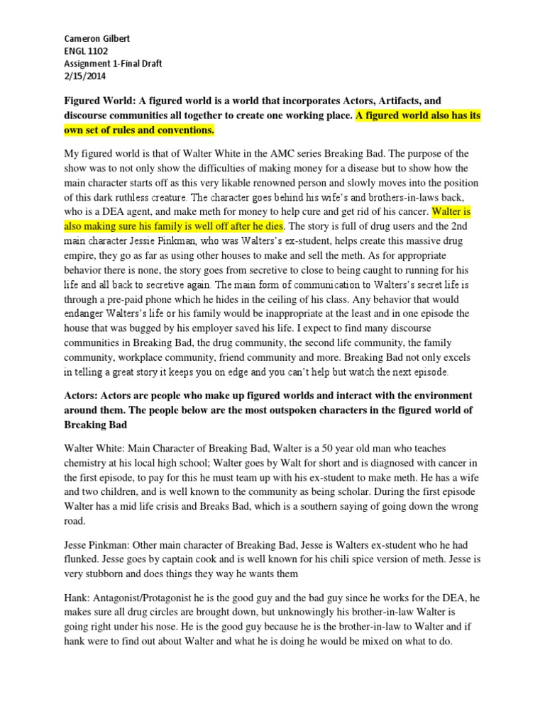 Figured World: A figured world is a world that incorporates Actors, Artifacts, and discourse communities all together to create one working place. A figured world also has its own set of rules and conventions. My figured world is that of Walter White in the AMC series Breaking Bad. The purpose of the show was to not only show the difficulties of making money for a disease but to show how the main character starts off as this very likable renowned person and slowly moves into the position of this dark ruthless creature. The character goes behind his wifes and brothers-in-laws back, who is a DEA agent, and make meth for money to help cure and get rid of his cancer. Walter is also making sure his family is well off after he dies. The story is full of drug users and the 2nd main character Jessie Pinkman, who was Walterss ex-student, helps create this massive drug empire, they go as far as using other houses to make and sell the meth. As for appropriate behavior there is none, the story goes from secretive to close to being caught to running for his life and all back to secretive again. The main form of communication to Walterss secret life is through a pre-paid phone which he hides in the ceiling of his class. Any behavior that would endanger Walterss life or his family would be inappropriate at the least and in one episode the house that was bugged by his employer saved his life. I expect to find many discourse communities in Breaking Bad, the drug community, the second life community, the family community, workplace community, friend community and more. Breaking Bad not only excels in telling a great story it keeps you on edge and you cant help but watch the next episode. Actors: Actors are people who make up figured worlds and interact with the environment around them. The people below are the most outspoken characters in the figured world of Breaking Bad Walter White: Main Character of Breaking Bad, Walter is a 50 year old man who teaches chemistry at his local high school; Walter goes by Walt for short and is diagnosed with cancer in the first episode, to pay for this he must team up with his ex-student to make meth. He has a wife and two children, and is well known to the community as being scholar. During the first episode Walter has a mid life crisis and Breaks Bad, which is a southern saying of going down the wrong road. Jesse Pinkman: Other main character of Breaking Bad, Jesse is Walters ex-student who he had flunked. Jesse goes by captain cook and is well known for his chili spice version of meth. Jesse is very stubborn and does things they way he wants them Hank: Antagonist/Protagonist he is the good guy and the bad guy since he works for the DEA, he makes sure all drug circles are brought down, but unknowingly his brother-in-law Walter is going right under his nose. He is the good guy because he is the brother-in-law to Walter and if hank were to find out about Walter and what he is doing he would be mixed on what to do.