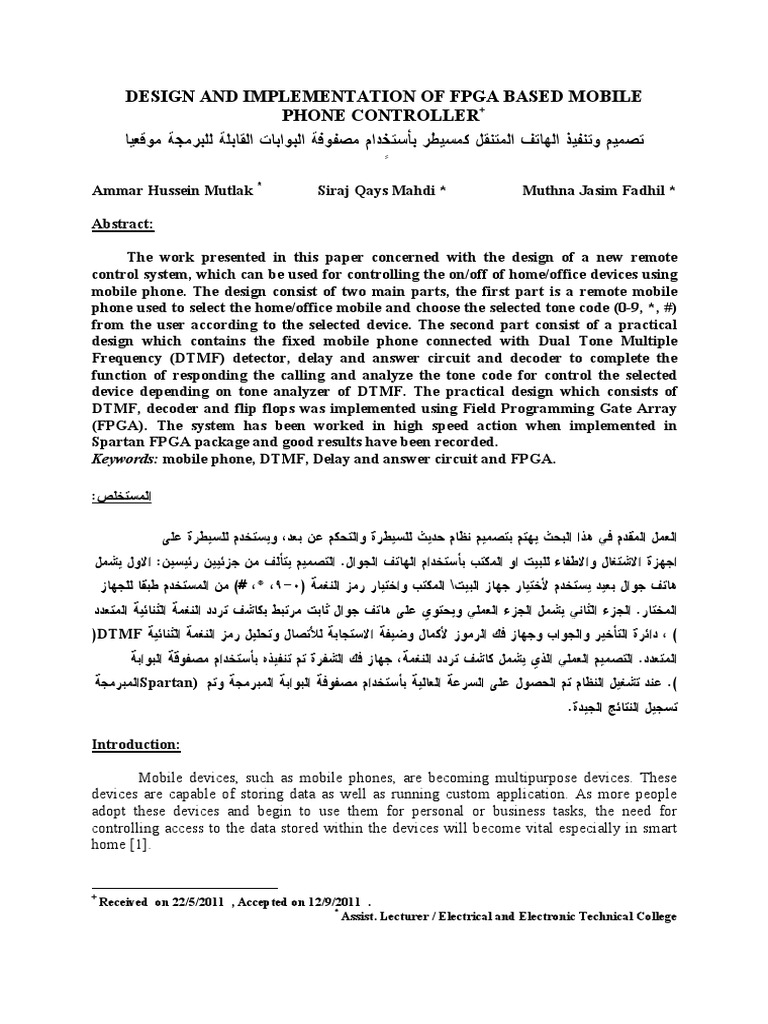 Ammar Hussein Mutlak Abstract: The work presented in this paper concerned with the design of a new remote control system, which can be used for controlling the on/off of home/office devices using mobile phone. The design consist of two main parts, the first part is a remote mobile phone used to select the home/office mobile and choose the selected tone code (0-9, *, #) from the user according to the selected device. The second part consist of a practical design which contains the fixed mobile phone connected with Dual Tone Multiple Frequency (DTMF) detector, delay and answer circuit and decoder to complete the function of responding the calling and analyze the tone code for control the selected device depending on tone analyzer of DTMF. The practical design which consists of DTMF, decoder and flip flops was implemented using Field Programming Gate Array (FPGA). The system has been worked in high speed action when implemented in Spartan FPGA package and good results have been recorded. Keywords: mobile phone, DTMF, Delay and answer circuit and FPGA. : : . ( # * -) \ . )DTMF ( . Spartan) .( . Introduction: Mobile devices, such as mobile phones, are becoming multipurpose devices. These devices are capable of storing data as well as running custom application. As more people adopt these devices and begin to use them for personal or business tasks, the need for controlling access to the data stored within the devices will become vital especially in smart home [1].
