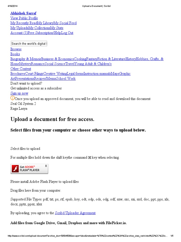 Please install Adobe Flash Player to upload files Drag files here from your computer. Supported File Types: pdf, txt, ps, rtf, epub, key, odt, odp, ods, odg, odf, sxw, sxc, sxi, sxd, doc, ppt, pps, xls, docx, pptx, ppsx, xlsx By uploading, you agree to the Scribd Uploader Agreement. Add files from Google Drive, Gmail, Dropbox and more with FilePicker.io.