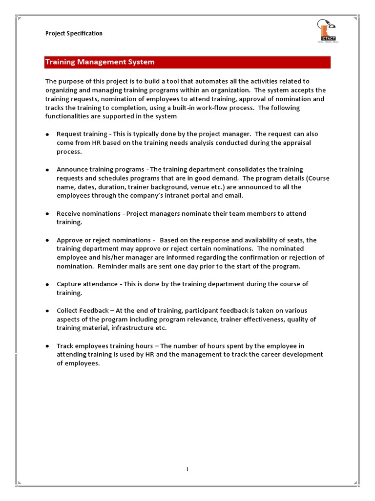The purpose of this project is to build a tool that automates all the activities related to organizing and managing training programs within an organization. The system accepts the training requests, nomination of employees to attend training, approval of nomination and tracks the training to completion, using a built-in work-flow process. The following functionalities are supported in the system Request training - This is typically done by the project manager. The request can also come from HR based on the training needs analysis conducted during the appraisal process. Announce training programs - The training department consolidates the training requests and schedules programs that are in good demand. The program details (Course name, dates, duration, trainer background, venue etc.) are announced to all the employees through the companys intranet portal and email. Receive nominations - Project managers nominate their team members to attend training. Approve or reject nominations - Based on the response and availability of seats, the training department may approve or reject certain nominations. The nominated employee and his/her manager are informed regarding the confirmation or rejection of nomination. Reminder mails are sent one day prior to the start of the program. Capture attendance - This is done by the training department during the course of training. Collect Feedback At the end of training, participant feedback is taken on various aspects of the program including program relevance, trainer effectiveness, quality of training material, infrastructure etc. Track employees training hours The number of hours spent by the employee in attending training is used by HR and the management to track the career development of employees.