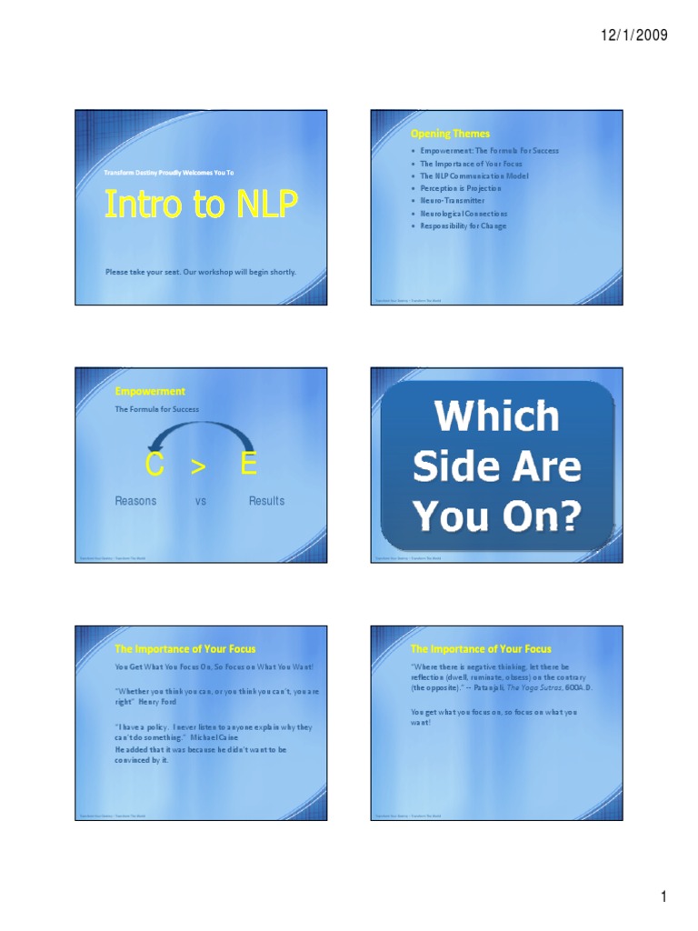 Empowerment:TheFormulaForSuccess TheImportanceofYourFocus TheNLPCommunicationModel PerceptionisProjection NeuroTransmitter NeurologicalConnections ResponsibilityforChange