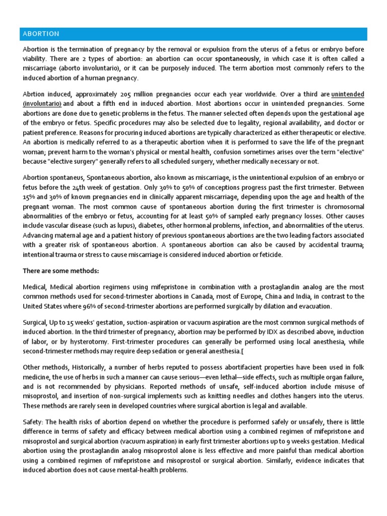 There are 2 types of abortion: an abortion can occur spontaneously, in which case it is often called a miscarriage (aborto involuntario), or it can be purposely induced. The term abortion most commonly refers to the induced abortion of a human pregnancy. Abrtion induced, approximately 205 million pregnancies occur each year worldwide. Over a third are unintended (involuntario) and about a fifth end in induced abortion. Most abortions occur in unintended pregnancies. Some abortions are done due to genetic problems in the fetus. The manner selected often depends upon the gestational age of the embryo or fetus. Specific procedures may also be selected due to legality, regional availability, and doctor or patient preference. Reasons for procuring induced abortions are typically characterized as either therapeutic or elective. An abortion is medically referred to as a therapeutic abortion when it is performed to save the life of the pregnant woman; prevent harm to the woman's physical or mental health, confusion sometimes arises over the term "elective" because "elective surgery" generally refers to all scheduled surgery, whether medically necessary or not. Abortion spontaneus, Spontaneous abortion, also known as miscarriage, is the unintentional expulsion of an embryo or fetus before the 24th week of gestation. Only 30% to 50% of conceptions progress past the first trimester. Between 15% and 30% of known pregnancies end in clinically apparent miscarriage, depending upon the age and health of the pregnant woman. The most common cause of spontaneous abortion during the first trimester is chromosomal abnormalities of the embryo or fetus, accounting for at least 50% of sampled early pregnancy losses. Other causes include vascular disease (such as lupus), diabetes, other hormonal problems, infection, and abnormalities of the uterus. Advancing maternal age and a patient history of previous spontaneous abortions are the two leading factors associated with a greater risk of spontaneous abortion. A spontaneous abortion can also be caused by accidental trauma; intentional trauma or stress to cause miscarriage is considered induced abortion or feticide. There are some methods: Medical, Medical abortion regimens using mifepristone in combination with a prostaglandin analog are the most common methods used for second-trimester abortions in Canada, most of Europe, China and India, in contrast to the United States where 96% of second-trimester abortions are performed surgically by dilation and evacuation. Surgical, Up to 15 weeks' gestation, suction-aspiration or vacuum aspiration are the most common surgical methods of induced abortion. In the third trimester of pregnancy, abortion may be performed by IDX as described above, induction of labor, or by hysterotomy. First-trimester procedures can generally be performed using local anesthesia, while second-trimester methods may require deep sedation or general anesthesia.[ Other methods, Historically, a number of herbs reputed to possess abortifacient properties have been used in folk medicine, the use of herbs in such a manner can cause seriouseven lethalside effects, such as multiple organ failure, and is not recommended by physicians. Reported methods of unsafe, self-induced abortion include misuse of misoprostol, and insertion of non-surgical implements such as knitting needles and clothes hangers into the uterus. These methods are rarely seen in developed countries where surgical abortion is legal and available. Safety: The health risks of abortion depend on whether the procedure is performed safely or unsafely, there is little difference in terms of safety and efficacy between medical abortion using a combined regimen of mifepristone and misoprostol and surgical abortion (vacuum aspiration) in early first trimester abortions up to 9 weeks gestation. Medical abortion using the prostaglandin analog misoprostol alone is less effective and more painful than medical abortion using a combined regimen of mifepristone and misoprostol or surgical abortion. Similarly, evidence indicates that induced abortion does not cause mental-health problems.