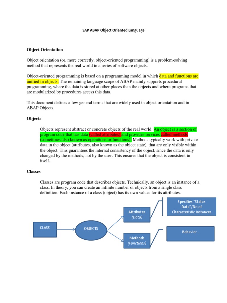 Object Orientation Object orientation (or, more correctly, object-oriented programming) is a problem-solving method that represents the real world in a series of software objects. Object-oriented programming is based on a programming model in which data and functions are unified in objects. The remaining language scope of ABAP mainly supports procedural programming, where the data is stored at other places than the objects and where programs that are modularized by procedures access this data. This document defines a few general terms that are widely used in object orientation and in ABAP Objects. Objects Objects represent abstract or concrete objects of the real world. An object is a section of program code that has data (called attributes) and provides services called methods (sometimes also known as operations or functions). Methods typically work with private data in the object (attributes, also known as the object state), that are only visible within the object. This guarantees the internal consistency of the object, since the data is only changed by the methods, not by the user. This ensures that the object is consistent in itself. Classes Classes are program code that describes objects. Technically, an object is an instance of a class. In theory, you can create an infinite number of objects from a single class definition. Each instance of a class (object) has its own values for its attributes.