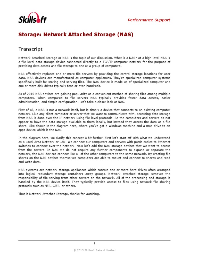 Network Attached Storage or NAS is the topic of our discussion. What is a NAS? At a high level NAS is a file level data storage device connected directly to a TCP/ P co!puter network for the purpose of providing data access and file storage to one or a group of co!puters. NAS effectively replaces one or !ore file servers "y providing the central storage locations for user data. NAS devices are !anufactured as co!puter appliances. They#re speciali$ed co!puter syste!s specifically "uilt for storing and serving files. The NAS device is !ade up of speciali$ed co!puter and one or !ore disk drives typically tens or even hundreds. As of %&'& NAS devices are gaining popularity as a convenient !ethod of sharing files a!ong !ultiple co!puters. When co!pared to file servers NAS typically provides faster data access( easier ad!inistration( and si!ple configuration. )et*s take a closer look at NAS. +irst of all( a NAS is not a network itself( "ut is si!ply a device that connects to an e,isting co!puter network. )ike any client co!puter or server that we want to co!!unicate with( accessing data storage fro! NAS is done over the P network using file level protocols. So the co!puters and servers do not appear to have the data storage availa"le to the! locally( "ut instead they access the data as a file share. )ike shown in the diagra! here( where you*ve got a Windows !achine and a !ap drive to an apps device which is the NAS. n the diagra! here( we clarify this concept a "it further. +irst let*s start off with what we understand as a )ocal Area Network or )AN. We connect our co!puters and servers with patch ca"les to -thernet switches to connect over the network. Now let*s add the NAS storage devices that we want to access fro! the servers. n NAS we do not re.uire any further co!ponents to e,pand or separate the network( the NAS devices connect like all of the other co!puters to the sa!e network. /y creating file shares on the NAS devices the!selves co!puters are a"le to !ount and connect to shares and read and write data. NAS syste!s are network storage appliances which contain one or !ore hard drives often arranged into logical redundant storage containers array groups. Network attached storage re!oves the responsi"ility of file serving fro! other servers on the network. All of the processing and storage is handled "y the NAS device itself. They typically provide access to files using network file sharing protocols such as N+S( C +S( or others. That is Network Attached Storage( thanks for watching.