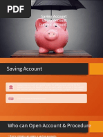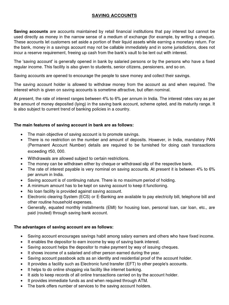 The main features of saving account in bank are as follows: The main objective of saving account is to promote savings. There is no restriction on the number and amount of deposits. However, in India, mandatory PAN (Permanent Account Number) details are required to be furnished for doing cash transactions exceeding 50, 000. Withdrawals are allowed subject to certain restrictions. The money can be withdrawn either by cheque or withdrawal slip of the respective bank. The rate of interest payable is very nominal on saving accounts. At present it is between 4% to 6% per annum in India. Saving account is of continuing nature. There is no maximum period of holding. A minimum amount has to be kept on saving account to keep it functioning. No loan facility is provided against saving account. Electronic clearing System (ECS) or E-Banking are available to pay electricity bill, telephone bill and other routine household expenses. Generally, equated monthly installments (EMI) for housing loan, personal loan, car loan, etc., are paid (routed) through saving bank account.
