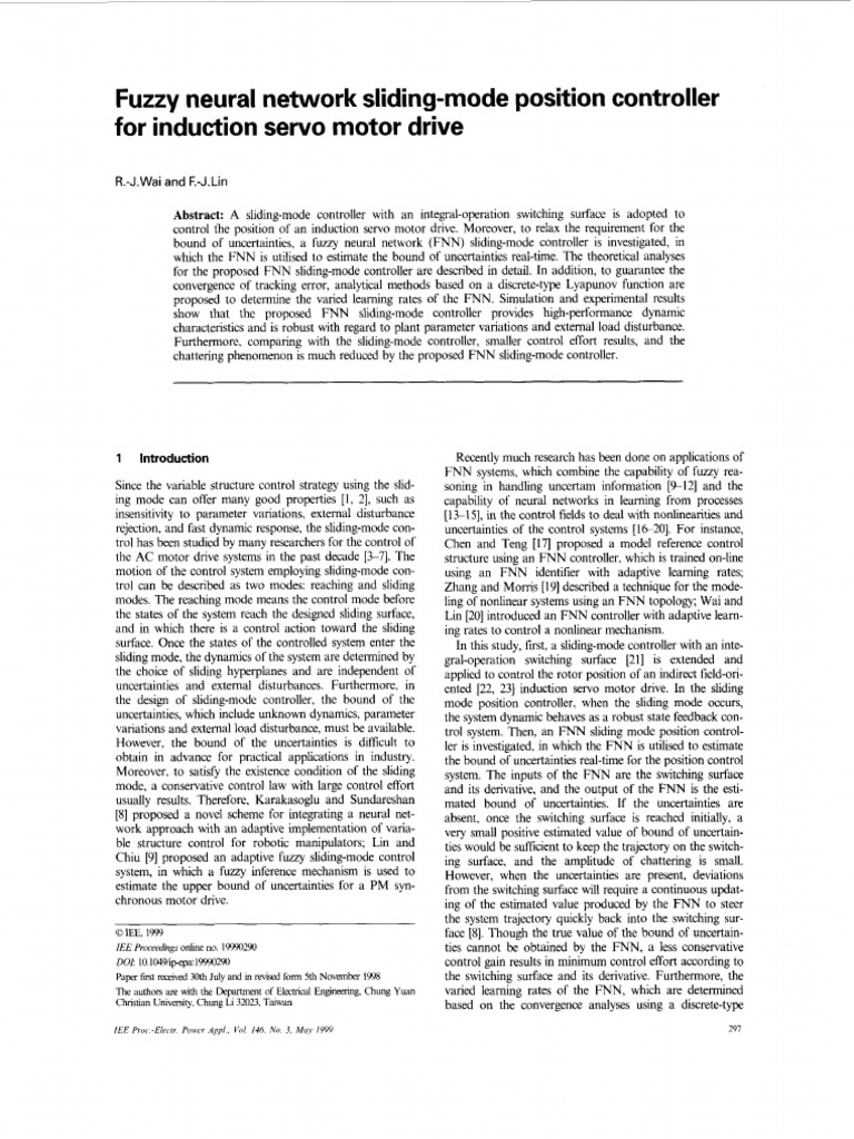 Abstract: A sliding-mode controller with an integral-operation switching surface is adopted to control the position of an induction servo motor drive. Moreover, to relax the requirement for the bound of uncertainties, a fuzzy neural network (FNN) sliding-mode controller is investigated, in which the FNN is utilised to estimate the bound of uncertainties real-time. The theoretical analyses for the proposed FNN sliding-mode controller are described in detail. In addition, to guarantee the convergence of tracking error, analytical methods based on a discrete-type Lyapunov function are proposed to determine the varied learning rates of the FNN. Simulation and experimental results show that the proposed FNN sliding-mode controller provides high-performance dynamic characteristics and is robust with regard to plant parameter variations and external load disturbance. Furthermore, comparing with the sliding-mode controller, smaller control effort results, and the chattering phenomenon is much reduced by the proposed FNN sliding-modecontroller.
