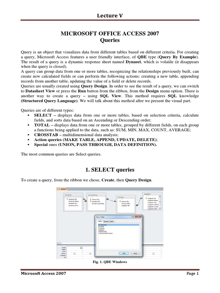 Lecture V MICROSOFT OFFICE ACCESS 2007 Queries