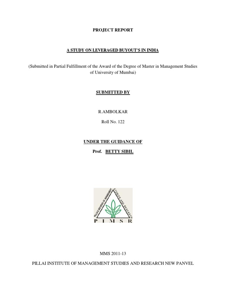 I Mr. R. AMBOLKAR of PILLAIS INSTITUTE OF MANAGEMENT STUDIES AND RESEARCH hereby declare that the Project Work titled A STUDY ON LEVERAGED BUYOUTS IN INDIA submitted as part of my curriculum of MMS degree is the original work done by me the project has not formed the basis for an award of any degree, associate ship, fellowship or any Similar titles.
