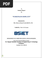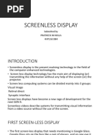 ABSTRACT: One of the more frustrating aspects of modern communications technology is that, as devices have miniaturized, they have become more difficult to interact with no one would type out a novel on a smartphone, for example. The lack of space on screen-based displays provides a clear opportunity for screenless displays to fill the gap. Full-sized keyboards can already be projected onto a surface for users to interact with, without concern over whether it will fit into their pocket. Perhaps evoking memories of the early Star Wars films, holographic images can now be generated in three dimensions; in 2013, MITs Media Lab reported a prototype inexpensive holographic colour video display with the resolution of a standard TV. 1. INTRODUCTION Well screenless display, AKA hologram, has such amazing potential that my hope is that the internet can be a medium for collaboration of ideas and information about screenless display that could help break down the barriers that prevent us from making it a reality. Essentially screenless display is a projection that can be seen projected onto the air itself. The only screenless display that has been achieved to my knowledge still uses fog as a medium to reflect light. Other options have been to use mirrors and plastic film to imitate the idea, but no one has been able to reflect light off of air itself. Can it be done? Its quite possible that it can. Light does reflect off of large amounts of air as we see in our atmosphere but doing it in such a manner that we could pinpoint it to a single area is immensely difficult. So why not take some time and look over some ideas I have collected about the possibilities of screenless display and maybe even share some of your own. Check some of the links below to get a better grasp on the development of the technology. Screenless display technology is likely to affect Lighting and projection technologies Software development/design Lifestyles of the visually impaired Career opportunities for the visually impaired