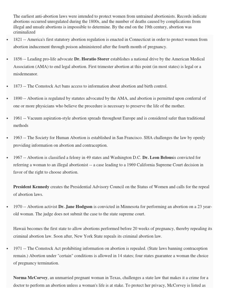 1873 -- The Comstock Act bans access to information about abortion and birth control. 1890 -- Abortion is regulated by statutes advocated by the AMA, and abortion is permitted upon conferral of one or more physicians who believe the procedure is necessary to preserve the life of the mother.
