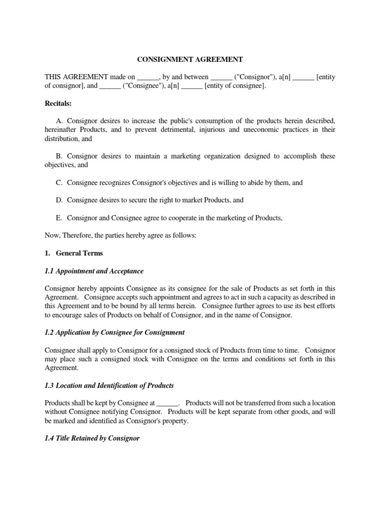 ______ ("Consignee"), a[n] ______ [entity of consignee]. Recitals: A. Consignor desires to increase the public's consumption of the products herein described, hereinafter Products, and to prevent detrimental, injurious and uneconomic practices in their distribution, and B. Consignor desires to maintain a marketing organization designed to accomplish these objectives, and C. Consignee recognizes Consignor's objectives and is willing to abide by them, and D. Consignee desires to secure the right to market Products, and E. Consignor and Consignee agree to cooperate in the marketing of Products, Now, Therefore, the parties hereby agree as follows: 1. General Terms 1.1 Appointment and Acceptance Consignor hereby appoints Consignee as its consignee for the sale of Products as set forth in this Agreement. Consignee accepts such appointment and agrees to act in such a capacity as described in this Agreement and to be bound by all terms herein. Consignee further agrees to use its best efforts to encourage sales of Products on behalf of Consignor, and in the name of Consignor. 1.2 Application by Consignee for Consignment Consignee shall apply to Consignor for a consigned stock of Products from time to time. Consignor may place such a consigned stock with Consignee on the terms and conditions set forth in this Agreement. 1.3 Location and Identification of Products Products shall be kept by Consignee at ______. Products will not be transferred from such a location without Consignee notifying Consignor. Products will be kept separate from other goods, and will be marked and identified as Consignor's property. 1.4 Title Retained by Consignor
