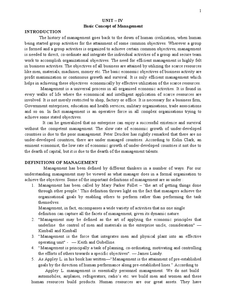n human being started group activities for the attainment of some common objectives. Wherever a group is formed and a group activities is organized to achieve certain common objectives, management is needed to direct, co-ordinate and integrate the individual activities of a group and secure team work to accomplish organizational objectives. The need for efficient management is highly felt in business activities. The objectives of all business are attained by utilizing the scarce resources like men, materials, machines, money etc. The basic economic objectives of business activity are profit ma imization or continuous growth and survival. !t is only efficient management which helps in achieving these objectives economically by effective utilization of the scarce resources. "anagement is a universal process in all organised economic activities. !t is found in every walks of life where the economical and intelligent application of scarce resources are involved. !t is not merely restricted to shop, factory or office. !t is necessary for a business firm, #overnment enterprises, education and health services, military organisations, trade associations and so on. !n fact management is an operative force in all comple organisations trying to achieve some stated objectives. !t can he generalized that no enterprise can enjoy a successful e istence and survival without the competent management. The slow rate of economic growth of under-developed countries is due to the poor management. $eter %rucker has rightly remarked that there are no under-developed countries, there are under managed countries. &ccording to 'olin (lark, an eminent economist, the low rate of economic growth of under-developed countries it not due to the dearth of capital, but it is due to the dearth of the management talents. DEFINITIONS OF MANAGEMENT "anagement has been defined by different thinkers in a number of ways. )or our understanding management may be viewed as what manager does in a formal organisation to achieve the objectives. *ome of the important definitions of management are as under + 1. "anagement has been called by "ary $arker )ollet , -the art of getting things done through other people.. This definition throws light on the fact that managers achieve the organisational goals by enabling others to perform rather than performing the task themselves. "anagement, in fact, encompasses a wide variety of activities that no one single definition can capture all the facets of management, given its dynamic nature. /. 0"anagement may be defined as the art of applying the economic principles that underline the control of men and materials in the enterprise uncle, consideration0 1 'imball and 'imball 2. 3"anagement is the force that integrates men and physical plant into an effective operating unit0 - 1 'eith and #ubelline. 4. 3"anagement is principally a task of planning, co-ordinating, motivating and controlling the efforts of others towards a specific objectives0. 1 5ames 6undy. 7. &s &ppley 6. in his book has written13"anagement is the attainment of pre-established goals by the direction of human performance along pre-established lines.8 &ccording to &ppley 6. management is essentially personnel management. We do not build automobiles, airplanes, refrigerators, radio.s etc. we build men and women and these human resources build products. 9uman resources are our great assets. They have