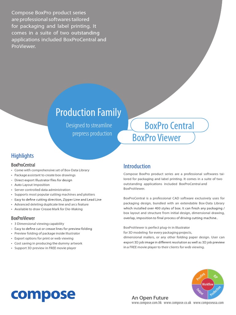 Compose BoxPro product series are a professional softwares tailored for packaging and label printing. It comes in a suite of two outstanding applications included BoxProCentral and BoxProViewer. BoxProCentral is a professional CAD software exclusively uses for packaging design, bundled with an extendable Box-Data Librar y box layout and structure from initial design, dimensional drawing,