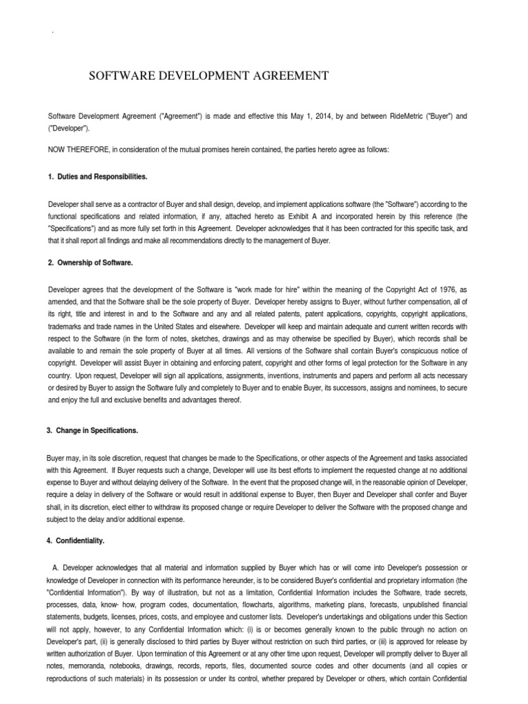 Software Development Agreement ("Agreement") is made and effective this May 1, 2014, by and between RideMetric ("Buyer") and