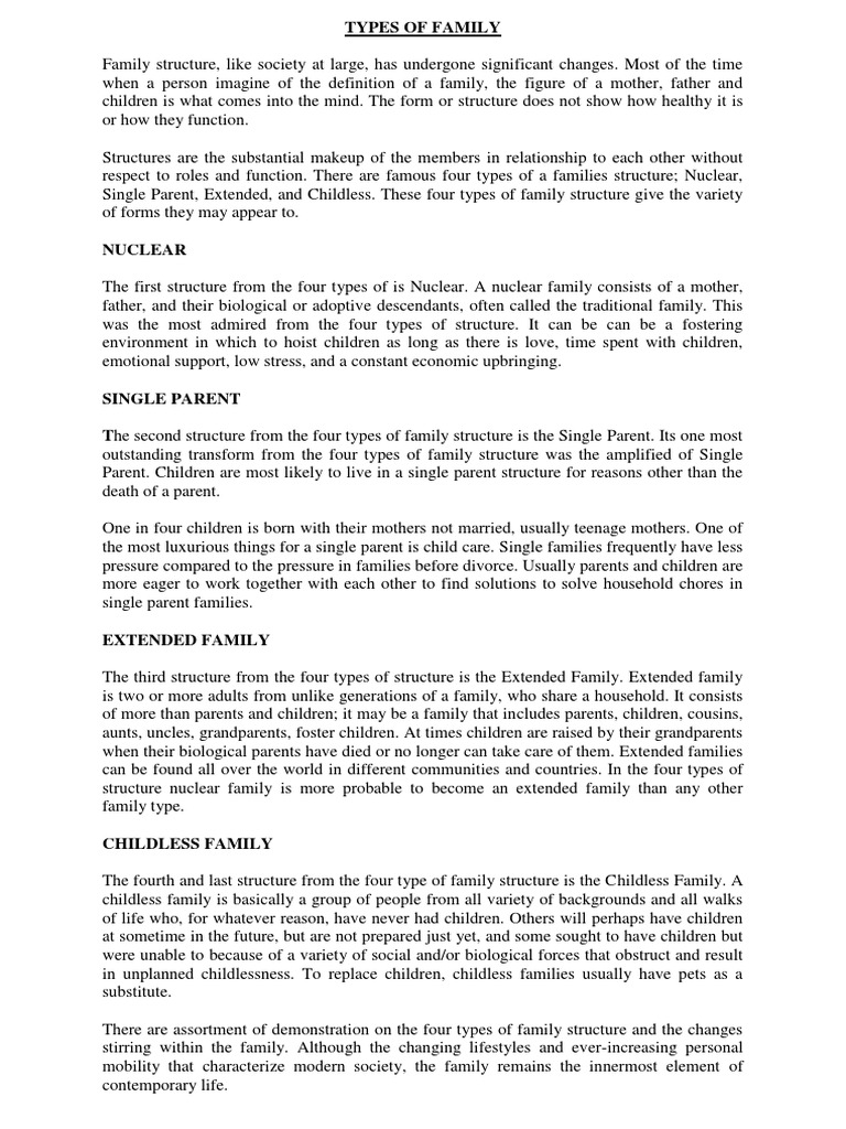 Single Parent, Extended, and Childless. These four types of family structure give the variety
