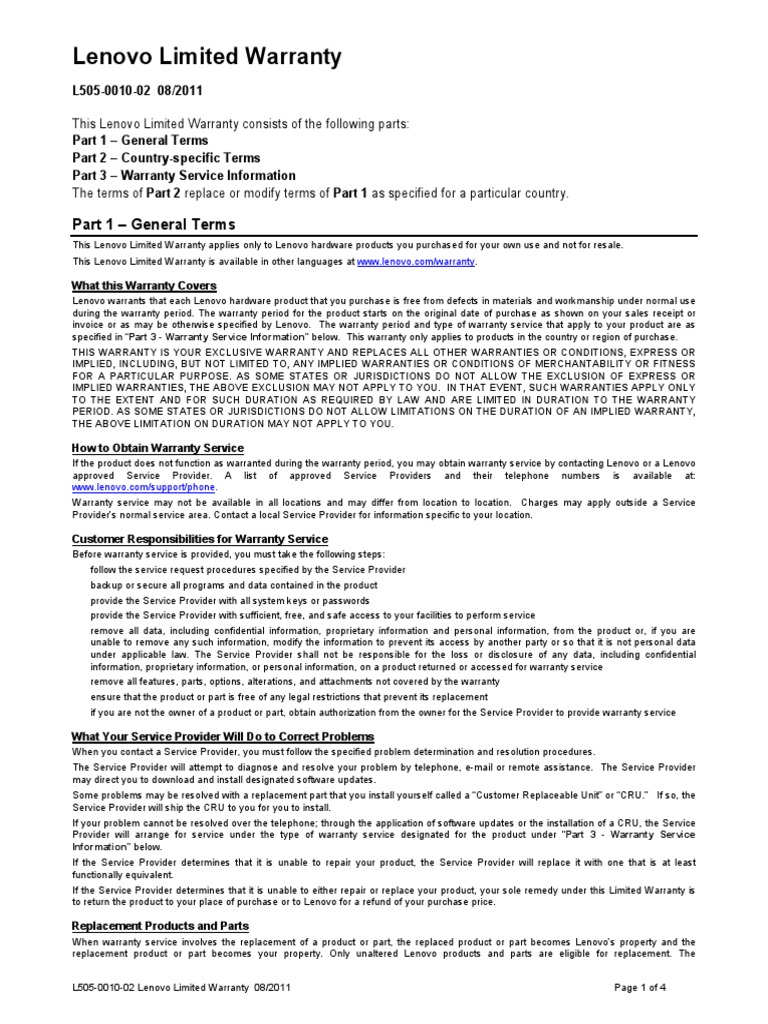 L505-0010-02 Lenovo Limited Warranty 08/2011 Page 1 of 4