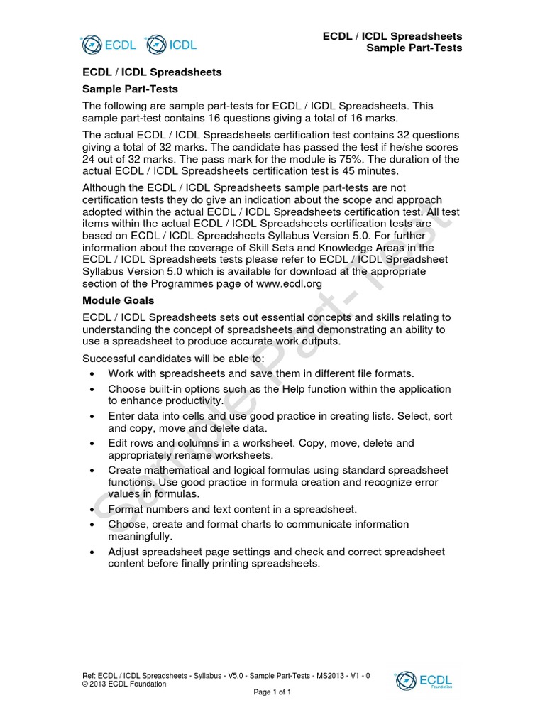 Although the ECDL / ICDL Spreadsheets sample part-tests are not