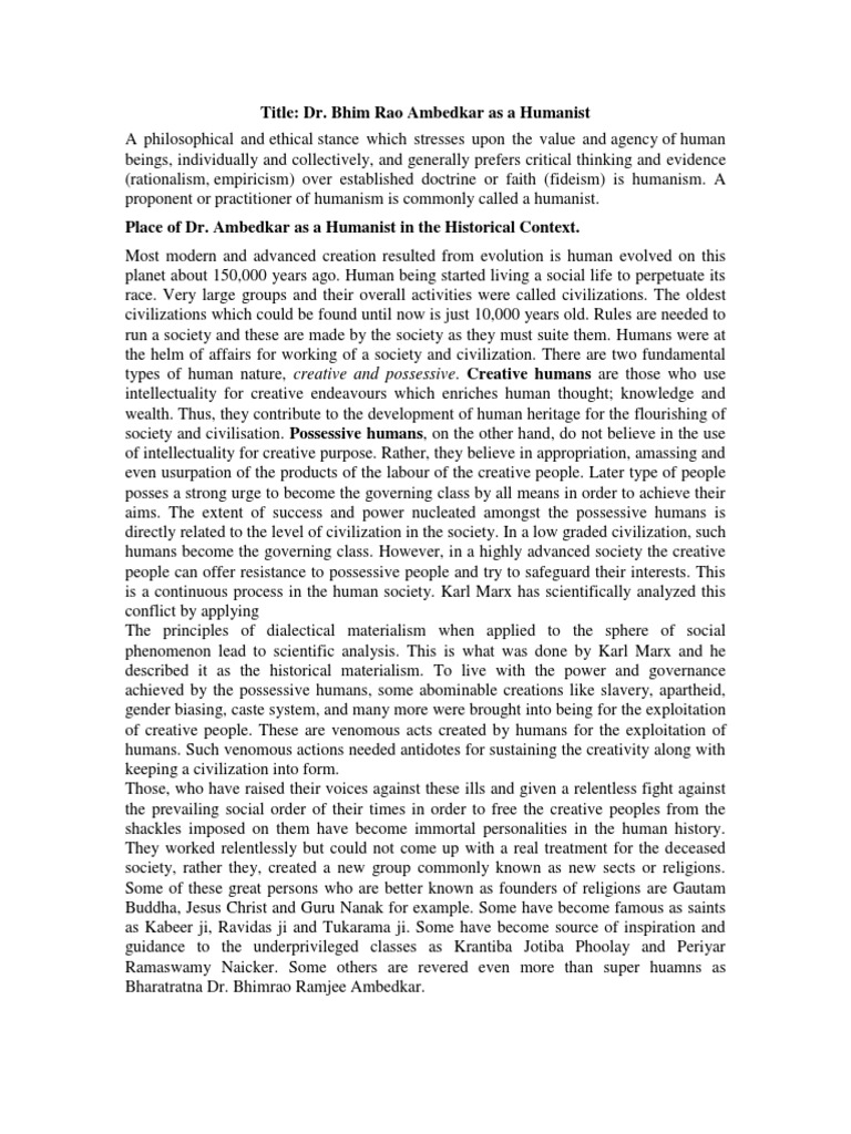Place of Dr. Ambedkar as a Humanist in the Historical Context.