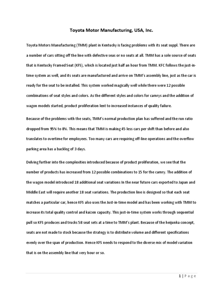 Toyota Motors Manufacturing (TMM) plant in Kentucky is facing problems with its seat suppl. There are