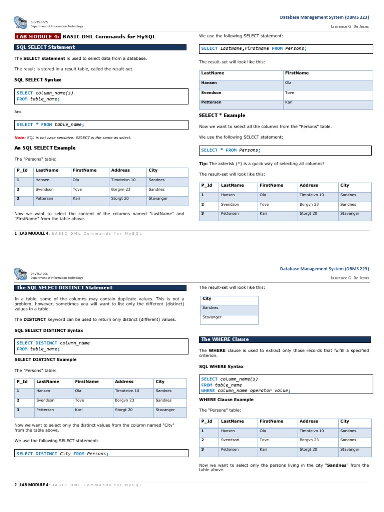 1 |LAB MODULE 4: B A S I C D M L C o m m a n d s f o r M y S Q L
