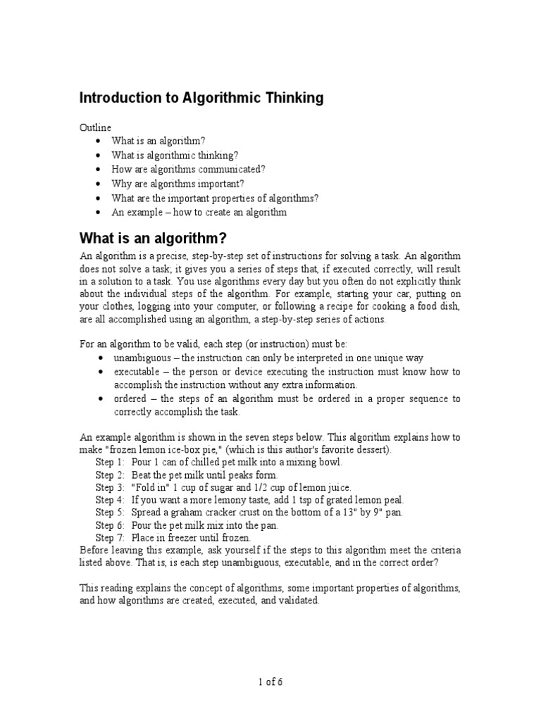 )his reading explains the concept of algorithms, some important properties of algorithms,