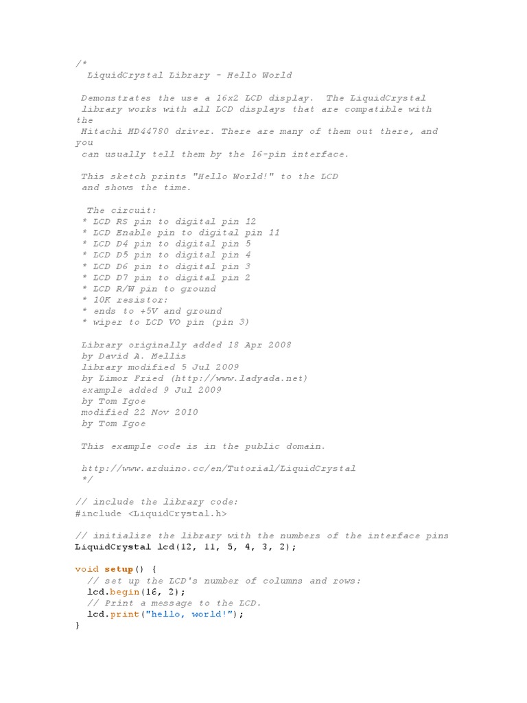 This sketch prints "Hello World!" to the LCD