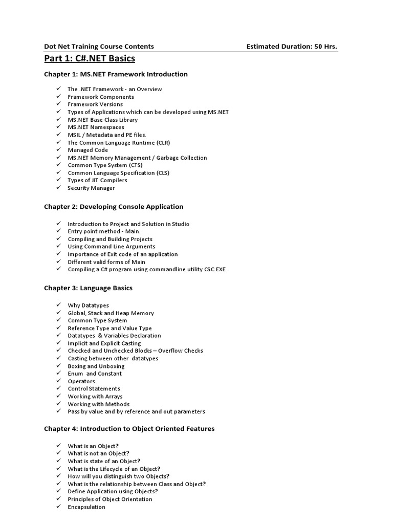 Dot Net Training Course Contents Estimated Duration: 50 Hrs.