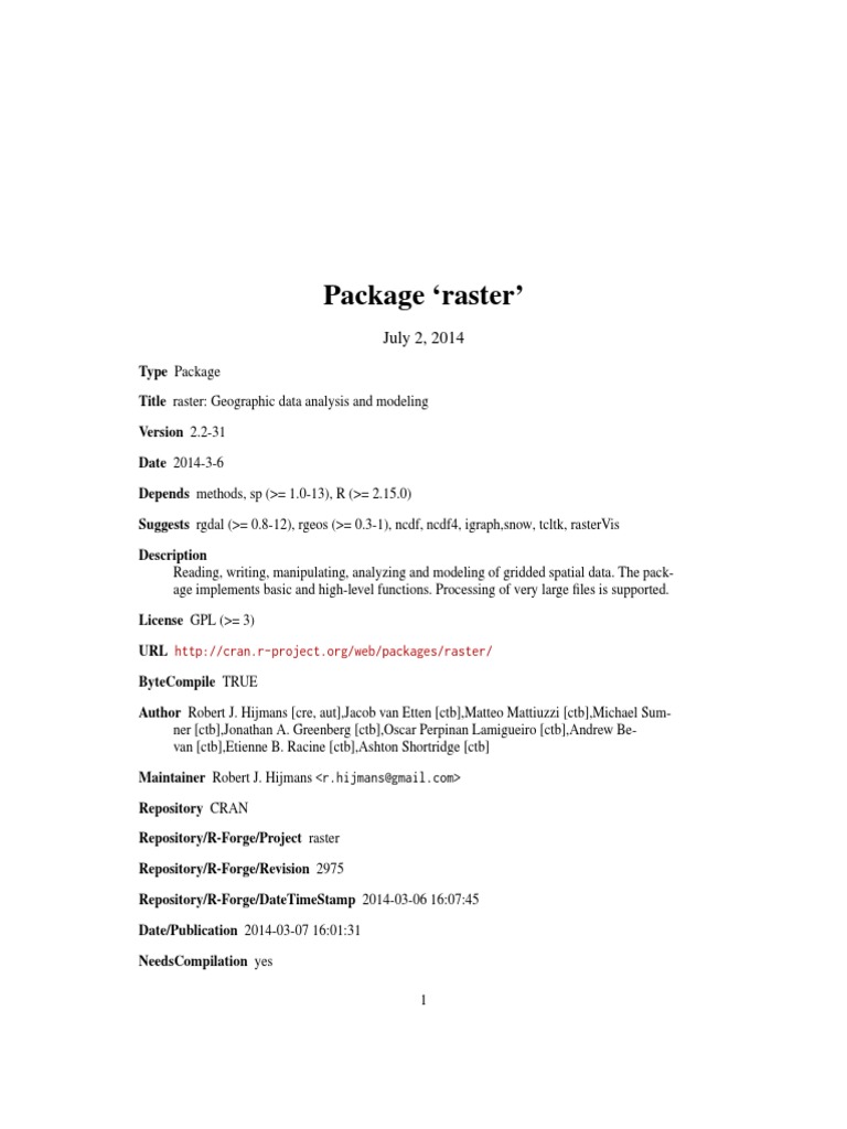 Author Robert J. Hijmans [cre, aut],Jacob van Etten [ctb],Matteo Mattiuzzi [ctb],Michael Sum-