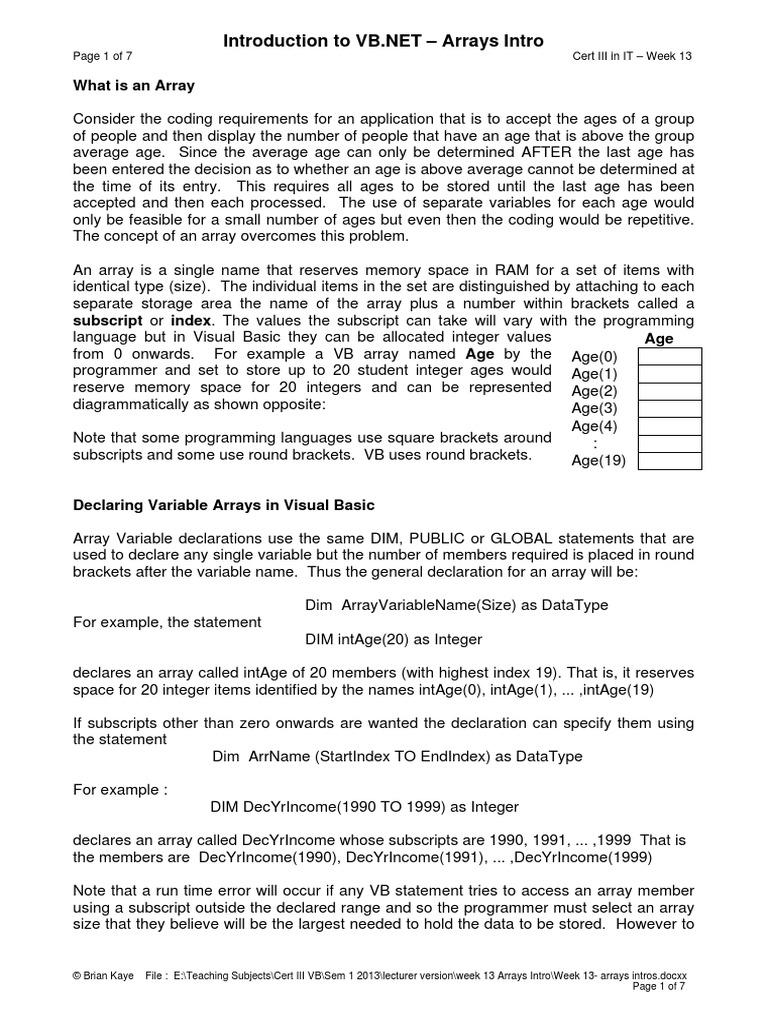 Brian Kaye File : E:\Teaching Subjects\Cert III VB\Sem 1 2013\lecturer version\week 13 Arrays Intro\Week 13- arrays intros.docxx