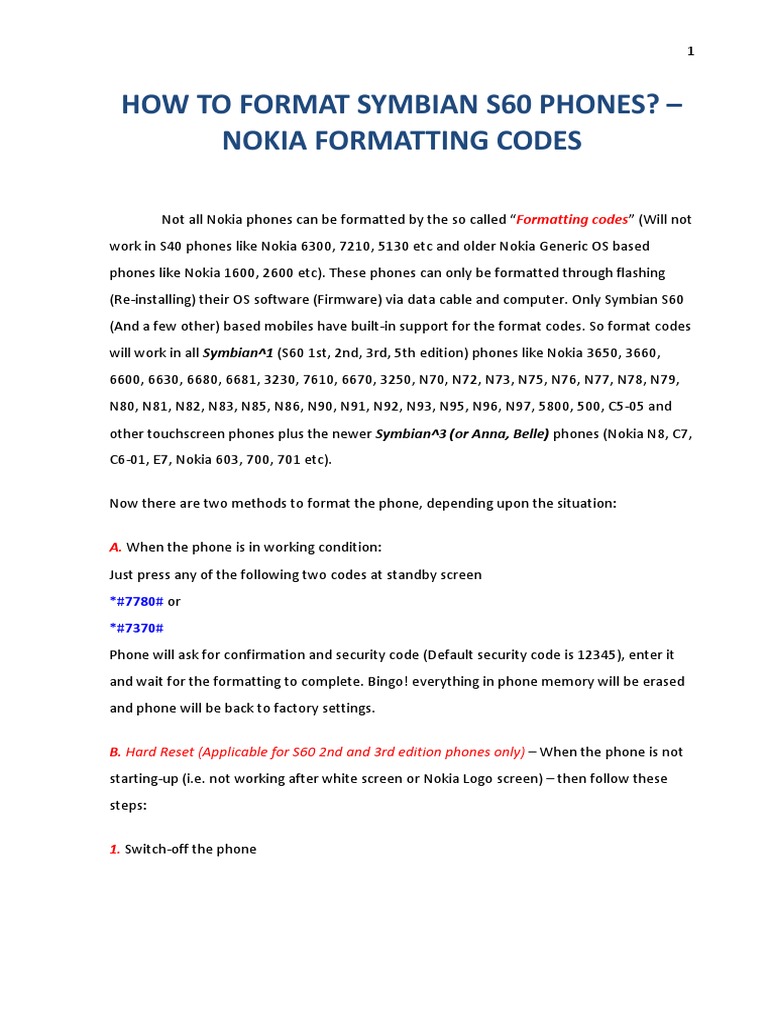 Not all Nokia phones can be formatted by the so called Formatting codes (Will not