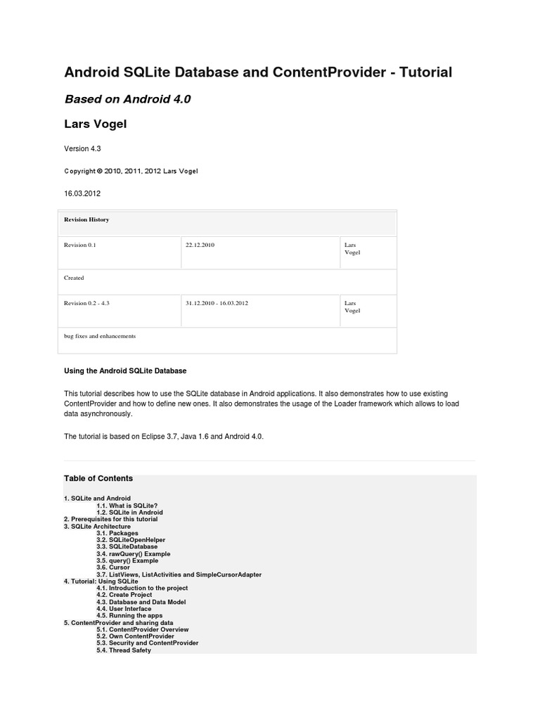 This tutorial describes how to use the SQLite database in Android applications. It also demonstrates how to use existing