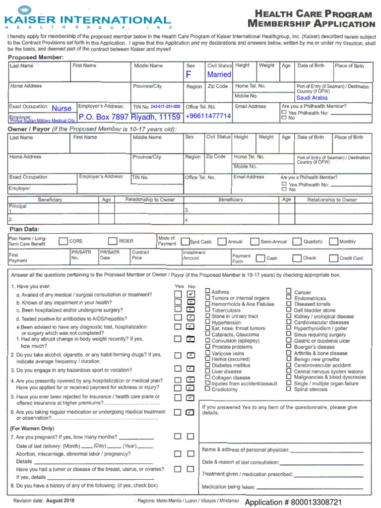 I hereby apply for membership of the proposed member below in the Health Care Program of Kaiser International Healthgroup, Inc. (Kaiser) described herein subject