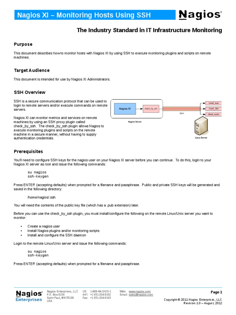 This document describes how to monitor hosts with Nagios XI by using SSH to execute monitoring plugins and scripts on remote