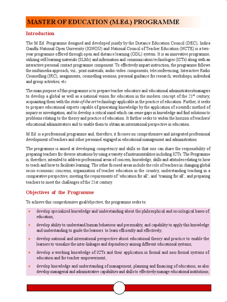 M.Ed. is a professional programme and, therefore, it focuses on comprehensive and integrated professional