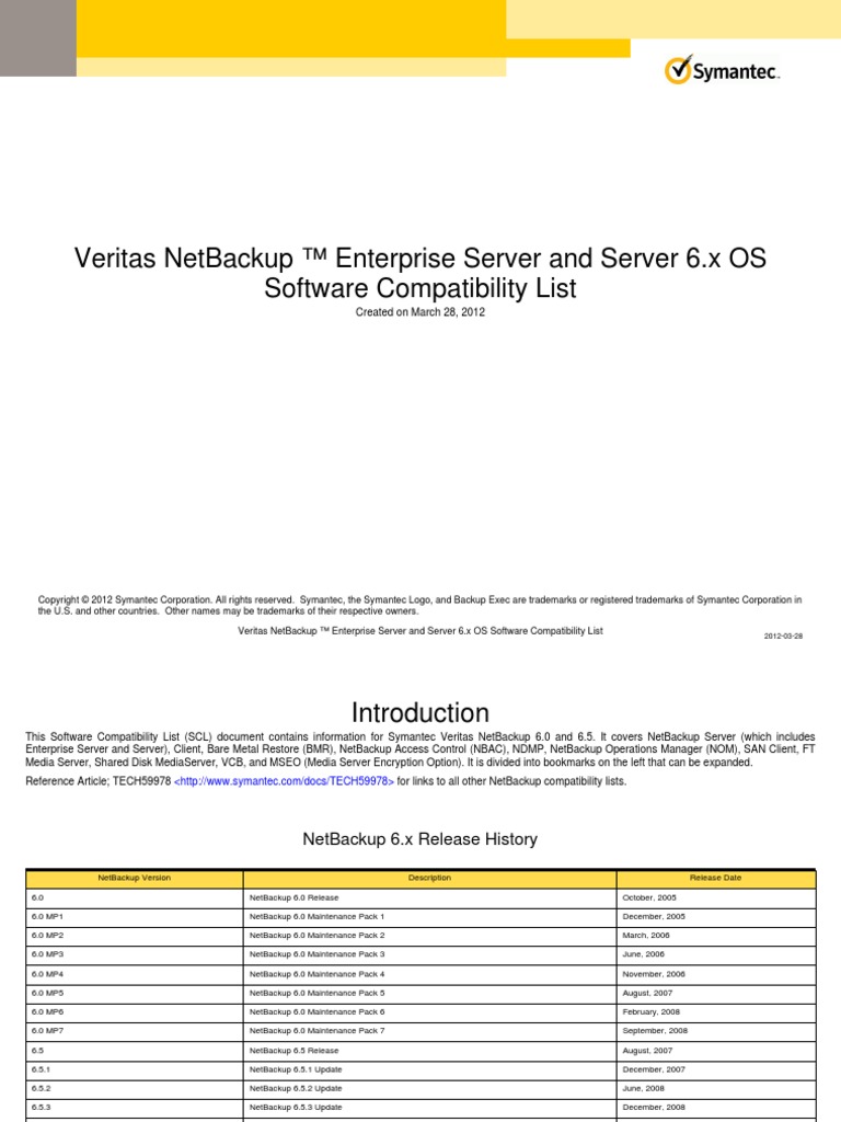 This Software Compatibility List (SCL) document contains information for Symantec Veritas NetBackup 6.0 and 6.5. It covers NetBackup Server (which includes
