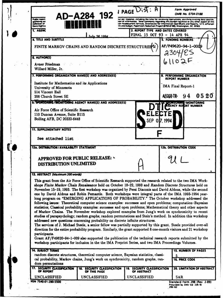 FINITE MARKOV CHAINS AND RANDOM DISCRETE STRUCTUREU) AF/F49620-94-1